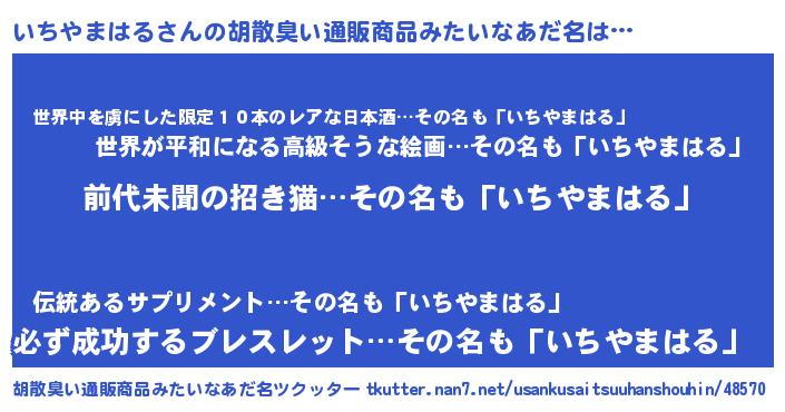 | 男性向けラノベタイトル風あだ名 | 『うちのいちやまはるが世界を掌握している!』 |