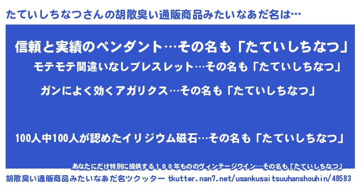 | 男性向けラノベタイトル風あだ名 | 『タテイシチナツスレイヤー』 |