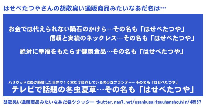 | ヘコむあだ名 | 『はせべたつや(爆)』『はせっぺ』 |