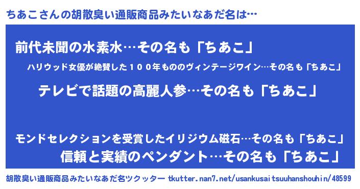 | 意味不明あだ名 | 『自称ちあこ』『永久保存ちあこ』 |