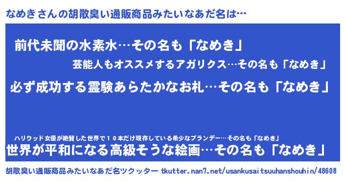 | 男性向けラノベタイトル風あだ名 | 『なめきの憂鬱』『魔法科高校のなめき』 |