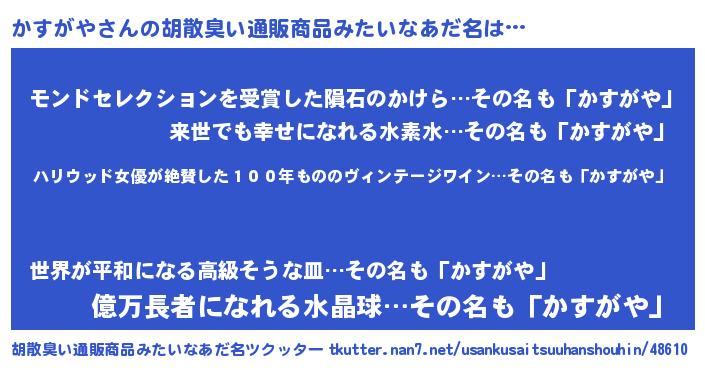 | 意味不明あだ名 | 『住所不定無職かすがや(4歳)』 |
