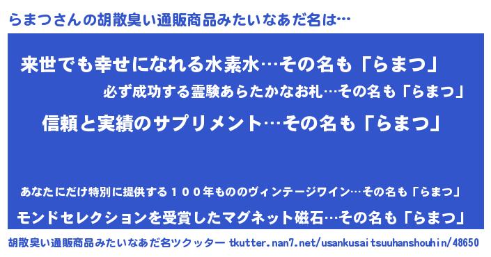 | ヘコむあだ名 | 『らまお』『らまつ(遠い目)』『豆乳』 |