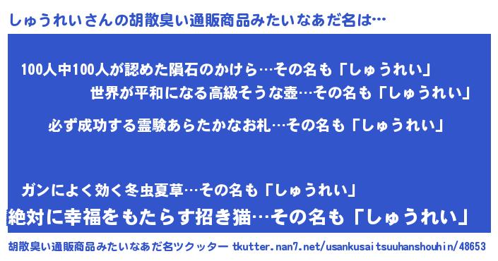 | 男性向けラノベタイトル風あだ名 | 『シュウレイスレイヤー』 |