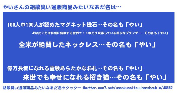 | 意味不明あだ名 | 『とにかく怪しいやい』『永久保存やい』 |
