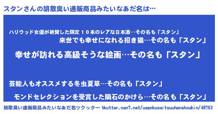 | 意味不明あだ名 | 『スタンフォーエバー』『永久保存スタン』 |