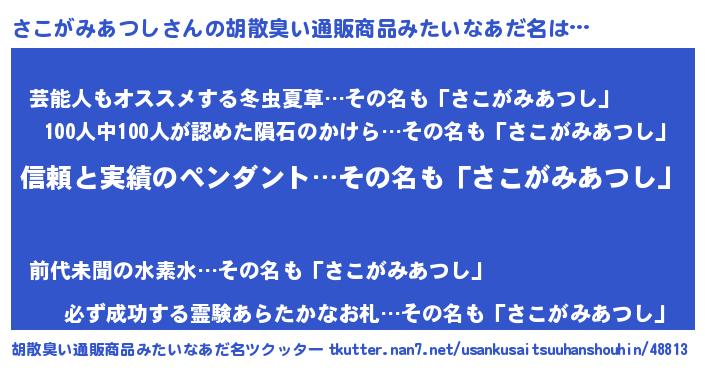 | 意味不明あだ名 | 『とにかく怪しいさこがみあつし』 |