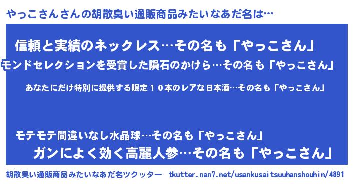 | 男性向けラノベタイトル風あだ名 | 『この素晴らしい世界にやっこさんを!』 |