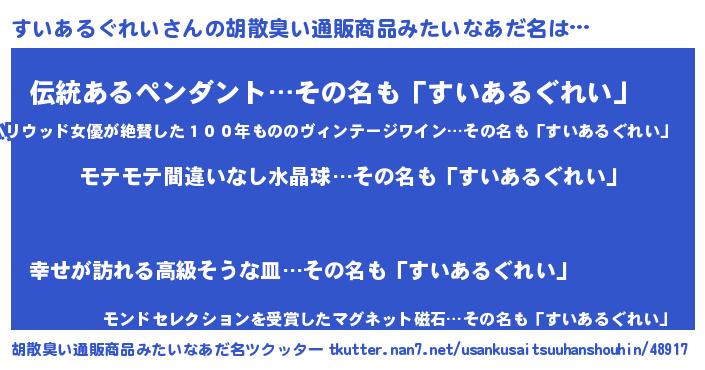 | 男性向けラノベタイトル風あだ名 | 『転生したらすいあるぐれいだった件』 |