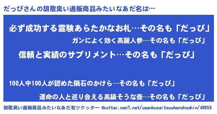 | 意味不明あだ名 | 『とにかく怪しいだっぴ』『自称だっぴ』 |