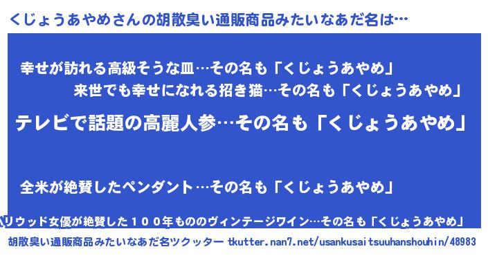 | 恥ずかしいあだ名 | 『クジョウアヤメデラックス』『くじちん』 |