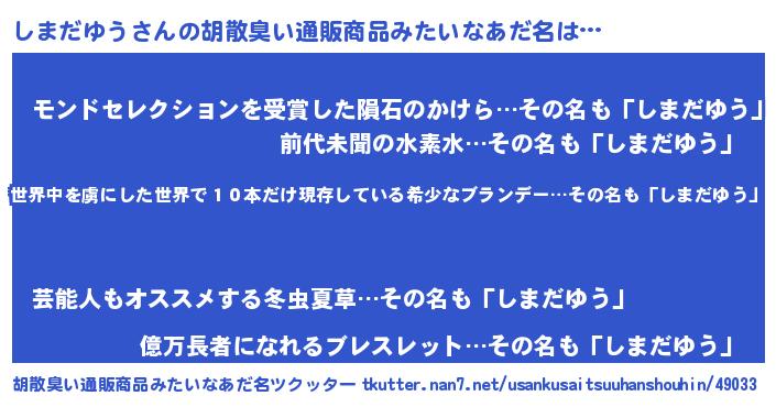 | ヘコむあだ名 | 『しまっふぃ~』『しまだゆう(遠い目)』 |