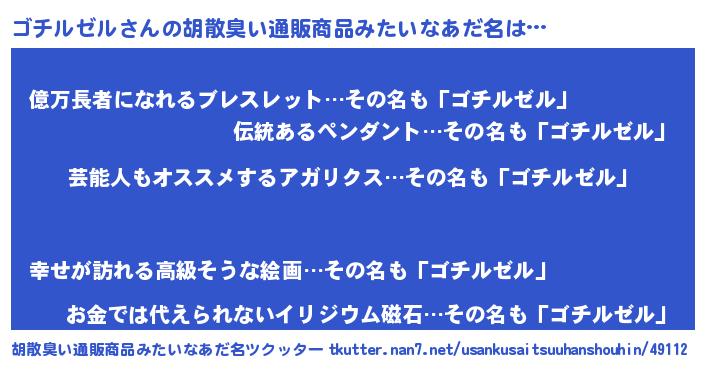 | 男性向けラノベタイトル風あだ名 | 『Re:ゴチルゼルから始める異世界生活』 |