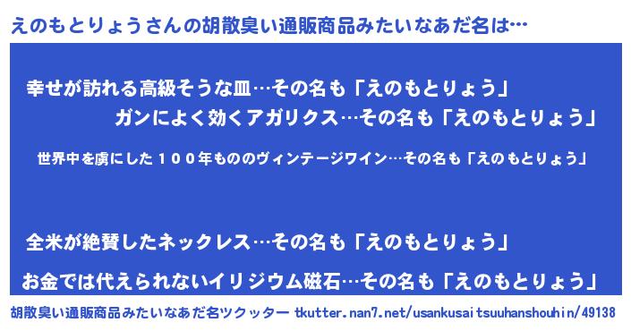 | 意味不明あだ名 | 『住所不定無職えのもとりょう(8歳)』 |