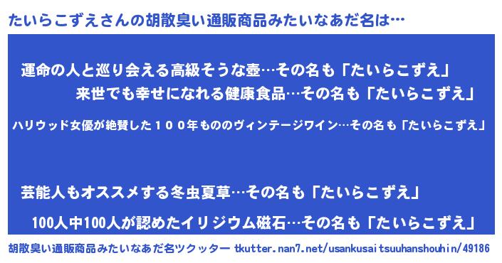 | 意味不明あだ名 | 『住所不定無職たいらこずえ(1歳)』 |