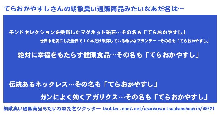 | 意味不明あだ名 | 『永久保存てらおかやすし』 |
