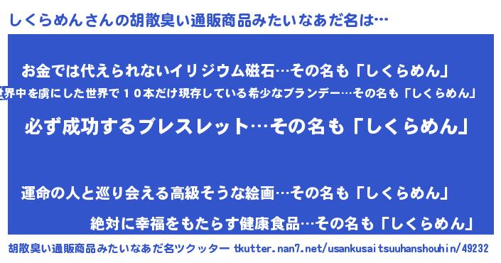 | 男性向けラノベタイトル風あだ名 | 『しくらめんの憂鬱』 |
