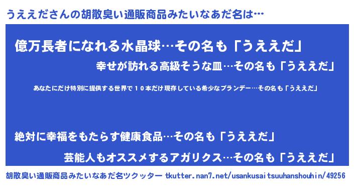 | 男性向けラノベタイトル風あだ名 | 『この素晴らしい世界にうええだを!』 |