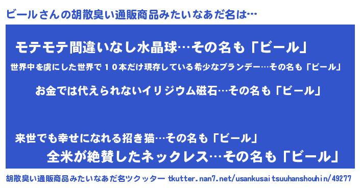 | 男性向けラノベタイトル風あだ名 | 『転生したらビールだった件』 |