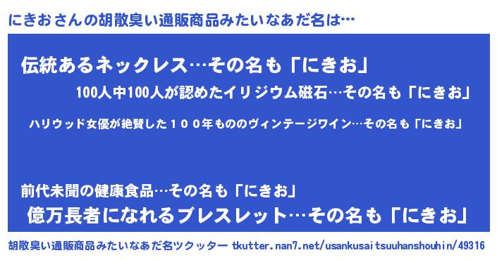 | 意味不明あだ名 | 『住所不定無職にきお(9歳)』 |