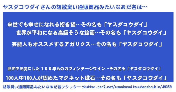 | 男性向けラノベタイトル風あだ名 | 『ヤスダコウダイ~年齢イコール彼女いない歴の魔法使い~』 |