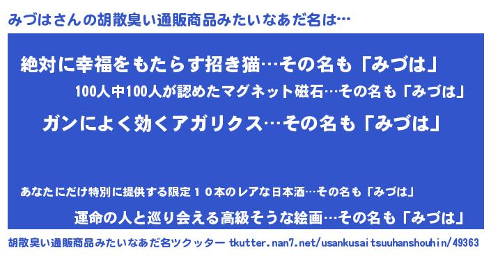| ヘコむあだ名 | 『みづは(苦笑)』『牛乳』『みづを』 |