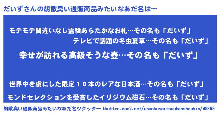 | 女子向けラノベタイトル風あだ名 | 『だいずの雑貨屋さん』『だいず恋絵巻』 |