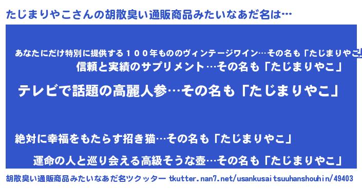 | 男性向けラノベタイトル風あだ名 | 『Re:たじまりやこから始める異世界生活』 |
