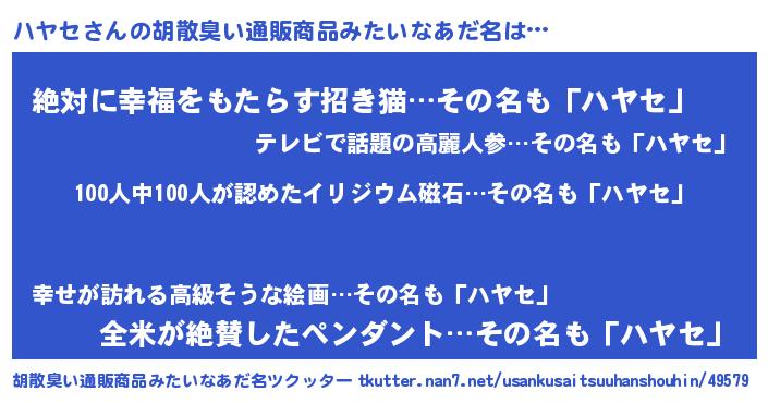 | ヘコむあだ名 | 『ハヤセ(笑)』『ハヤを』『豆乳』 |