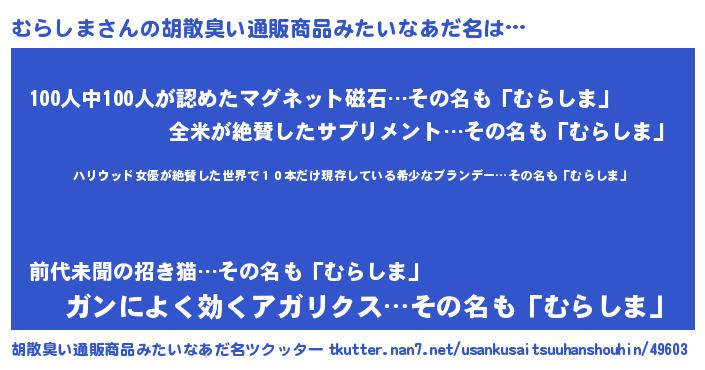 | 意味不明あだ名 | 『住所不定無職むらしま(81歳)』 |