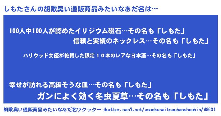 | 男性向けラノベタイトル風あだ名 | 『魔弾の王としもた』『緋弾のシモタ』 |