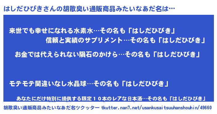 | ヘコむあだ名 | 『はしだひびき(震え声)』『はしっちょ』 |