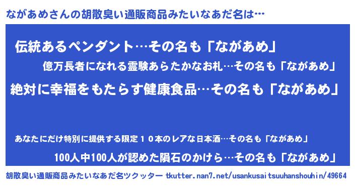 | 意味不明あだ名 | 『永久保存ながあめ』『ペロリンながあめ』 |