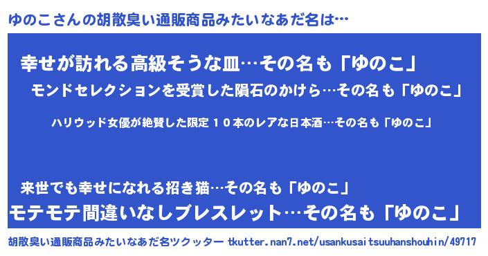 | ヘコむあだ名 | 『つくし』『ゆのにー』『ゆのぷりん』 |