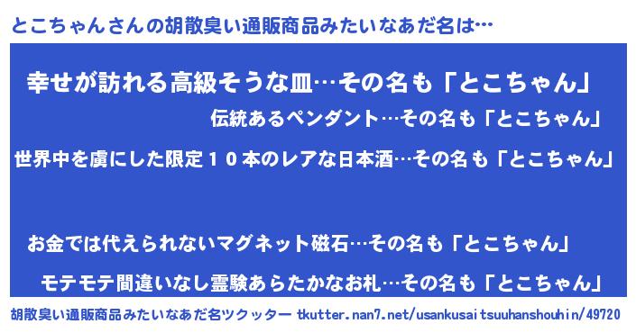 | ヘコむあだ名 | 『なまこ酢』『とこっふぃ~』 |