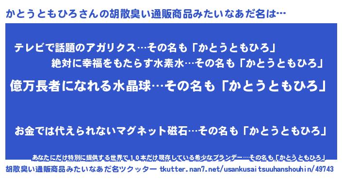 | 男性向けラノベタイトル風あだ名 | 『カトウトモヒロアートオンライン』 |
