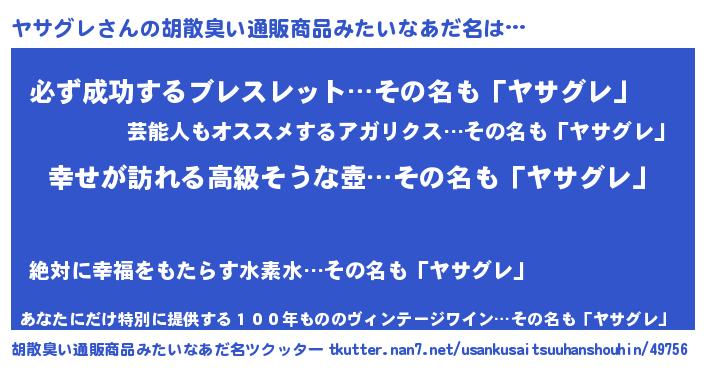 | ヘコむあだ名 | 『つくし』『ヤサにゅー』『ヤサお』 |