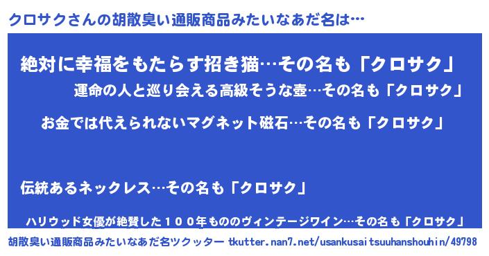 | 男性向けラノベタイトル風あだ名 | 『クロサクに滅ぼされるだけの簡単なお仕事です』 |