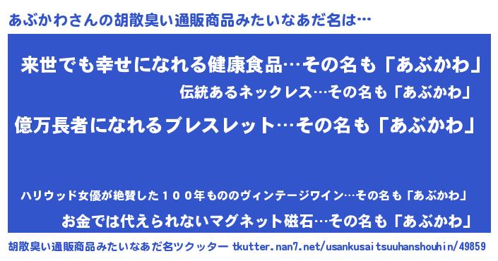 | 意味不明あだ名 | 『ペロリンあぶかわ』『永久保存あぶかわ』 |