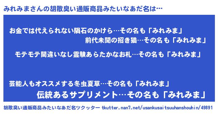 | ヘコむあだ名 | 『みれもー』『みれぷりん』 |