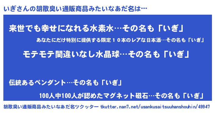 | 男性向けラノベタイトル風あだ名 | 『いぎの憂鬱』『転生したらいぎだった件』 |
