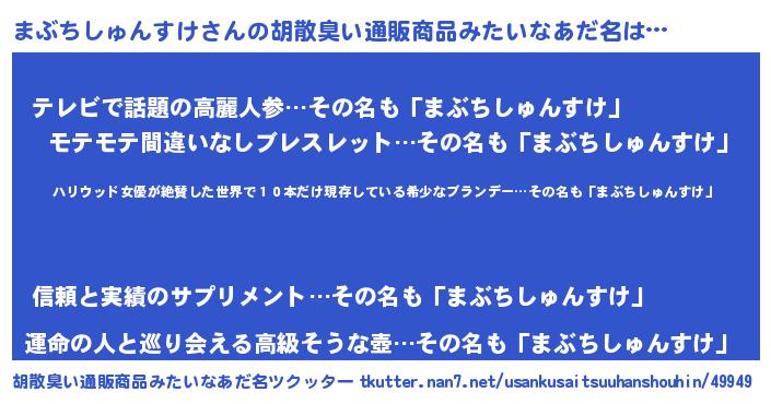| 女子向けラノベタイトル風あだ名 | 『まぶちしゅんすけが死なない童話 林檎のまぶちしゅんすけの診療簿』 |