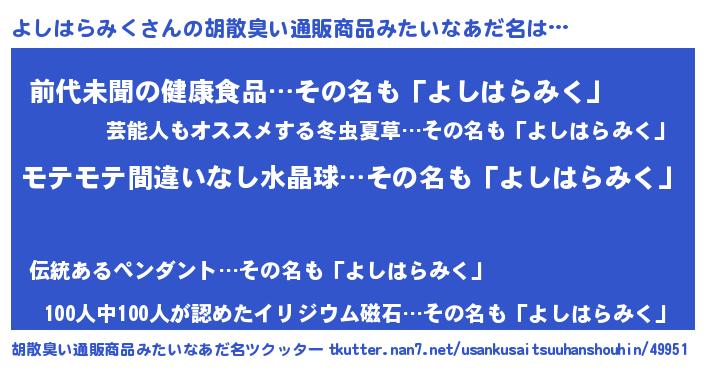 | ヘコむあだ名 | 『よしにゅー』『よしはらみく(震え声)』 |