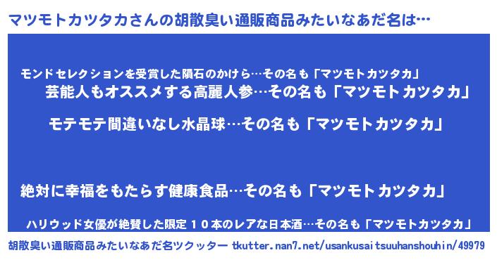 | ヘコむあだ名 | 『マツにゅー』『マツモトカツタカ(爆)』 |