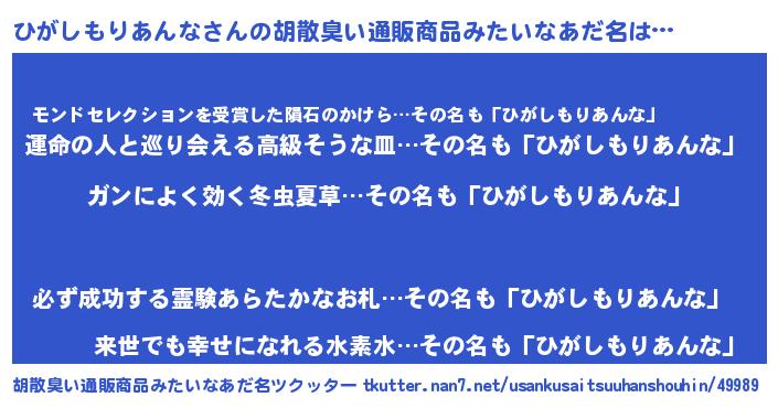 | ヘコむあだ名 | 『ひがしもりあんな(苦笑)』『レバニラ』 |