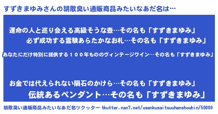 | 男性向けラノベタイトル風あだ名 | 『この素晴らしい世界にすずきまゆみを!』 |