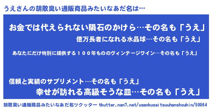 | 意味不明あだ名 | 『住所不定無職うえ(8歳)』『ペロリンうえ』 |