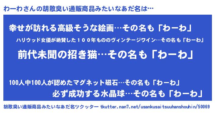 | ヒーロー風カッコイイあだ名 | 『ネオワーワ』『ウルトラわーわマン』 |