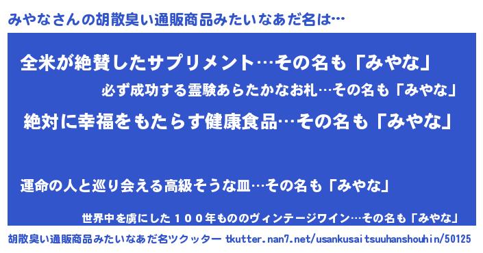 | ヘコむあだ名 | 『みやな(笑)』『みやを』『みやにー』 |