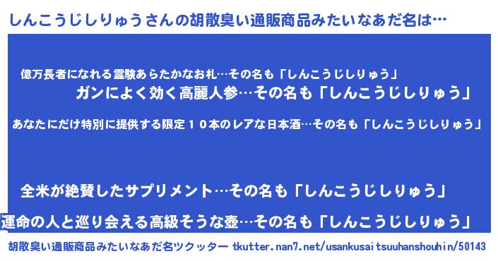 | 意味不明あだ名 | 『住所不定無職しんこうじしりゅう(14歳)』 |